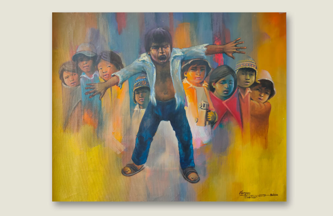 Vargas Cuellar, no piensa en cuadro dentro de su estudio o taller, donde se producen algunos procesos materials del arte, los toma de la calle, de la barriada, del campo, de la mina, lleva sus personajes al estudio.